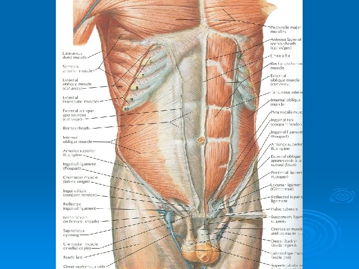 Muscles Ø Consists of Three broad thin sheets that are aponeurotic in front Ø From exterior to interior they are: Ø External oblique, internal oblique, and transverse Ø A wide vertical muscle, the rectus abdominis Ø They lie on either side of the midline anteriorly