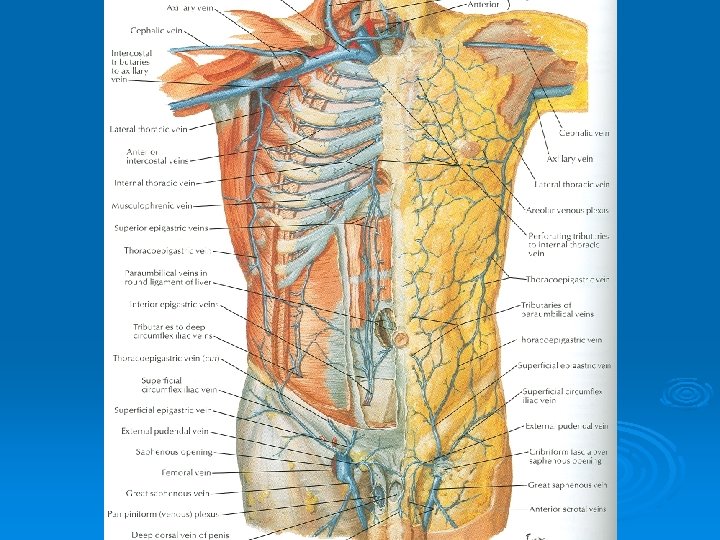 Venous Drainage Ø Venous blood is collected into a network of veins that radiate from the umbilicus Ø The network is drained above into the axillary vein via the lateral thoracic vein Ø Below into the femoral vein via the superficial epigastric and the great saphenous veins Ø Few small veins, the paraumbilical veins form a clinically important portal-system venous anastomosis
