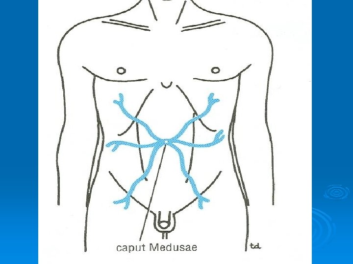Caput Medusae Ø The superficial veins around the umbilicus and the paraumbilical veins connecting them to the portal vein may become grossly distended in case of portal vein obstruction Ø The distended subcutaneous veins radiate out from the umbilicus, producing in severe cases the clinical picture called Caput Medusae