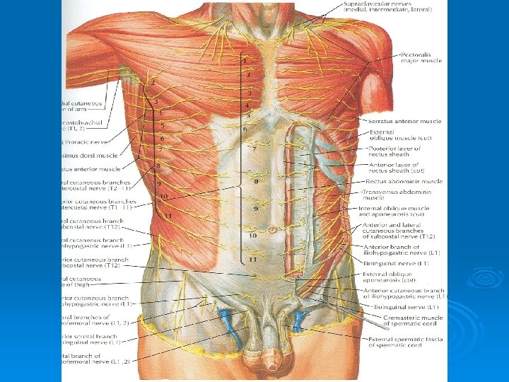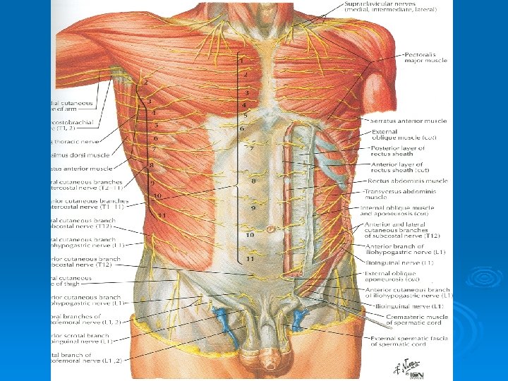 Cutaneous Nerve Supply Ø Is derived from the anterior rami of the lower six thoracic and first lumbar nerves Ø Thoracic nerves are the lower five intercostal and the subcostal nerves Ø First lumbar nerve is represented by the iliohypogastric and ilioinguinal nerves