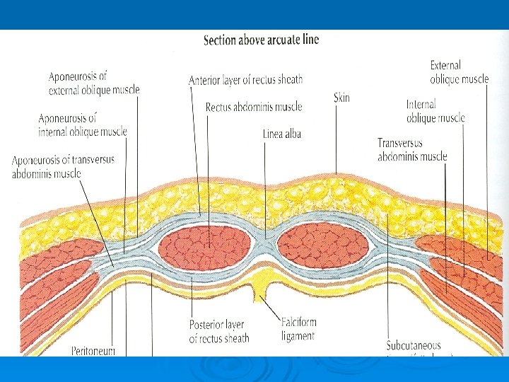 Rectus Sheath Ø Between the level of the anterosuperior iliac spine and the pubis, the aponeurosis of all three muscles form the anterior wall Ø The posterior wall is absent Ø The rectus muscle lies in contact with the fascia transversalis