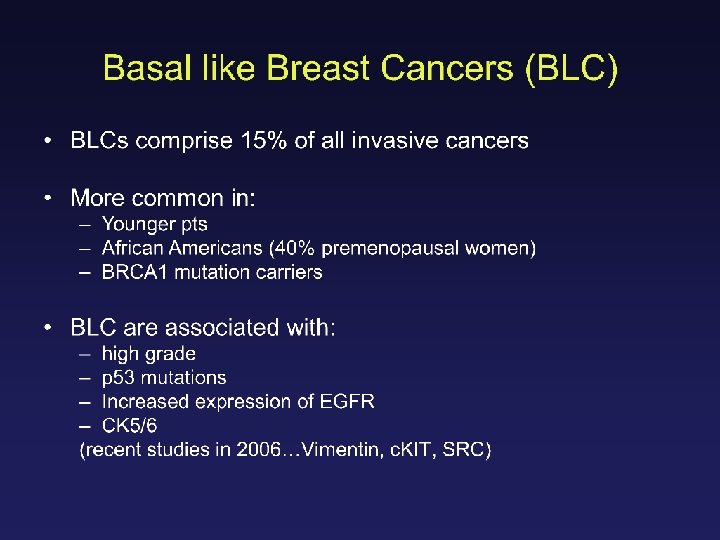 Molecular Classifications of Breast Tumors Luminal A ER + high Prolif - P 53 mutations 16% Luminal B + 71% Basal -like ER + low ER - + ERBB 2 + Normal-like ER-/+ ER - -/+ - 75%, also BRCA 1 86% Sorlie 2007