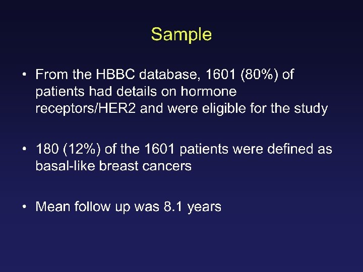 Characteristics of studies - I Study Comparison HER 2 status determined (%) NSABP B 11 PF vs PAF 638/682 (94%) NSABP B 15 CMF vs AC 2. 034/2. 295 (89%) GUN 3 CMF vs CMF/EV 123/220 (56%) Brussels CMF vs HEC/EC 354/777 (46%) Milan CMF vs CMF→ A 506/552 (92%) DBCCG - 89 - D CMF vs FEC 805/980 (82%) NCIC MA 5 CMF vs CEF 628/710 (88%) 5. 088/6. 216 (82%) Total (available/randomised) SABCS 2006