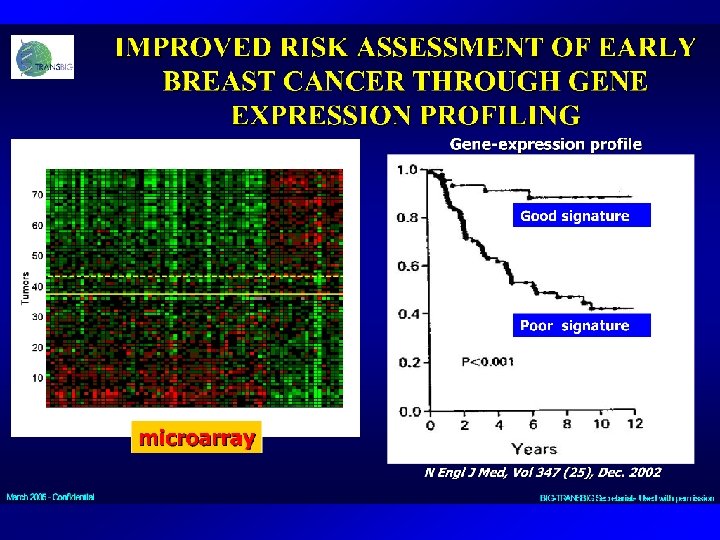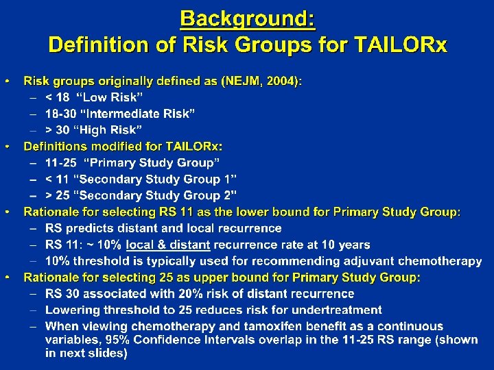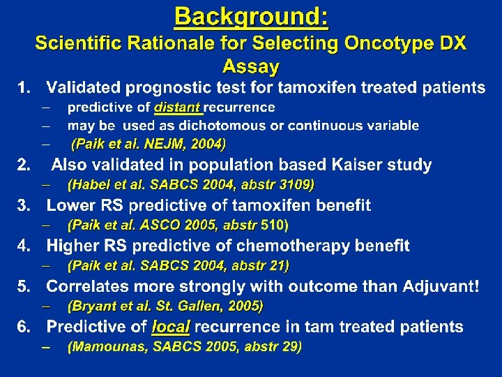 Oncotype DX • A multigene assay to predict recurrence of Tamoxifen-treated, node-negative breast cancer (Paik NEJM 204) • 21 genes - proliferation (5), invasion (2), HER 2 (2), Estrogen (4) , 3 others and 5 reference genes with a Recurrence Score (RS) algorithm • For node negative, tam treated (JCO 2007): –Luminal A = low risk oncotype DX –Luminal B = mod/high risk