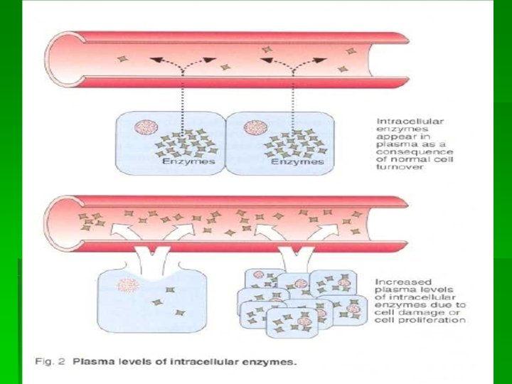 § Small amounts of intracellular enzymes are present in the blood as a result of normal cell turnover. When damage to cells occurs, increased amounts of enzymes will be released and their concentrations in the blood will rise.
