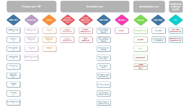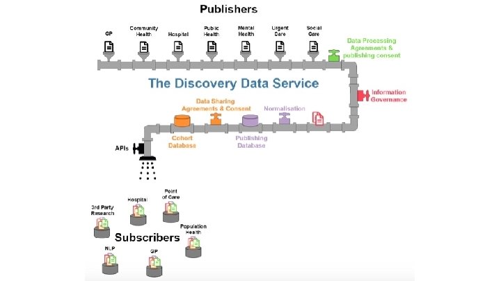 Moving to the new world: the LHR • east London Patient Record (e. LPR) • IHE standards • SNOMED encoded lists • Free text • Multi-user platform • Discovery Data Service • Data data service for health and social care • SNOMED on FHIR • Publisher- subscriber model • Research access and consent model