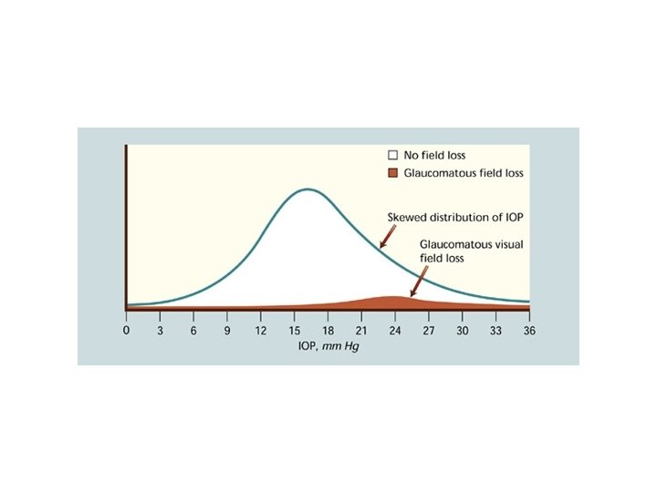 IOP Mean 16 mm. Hg SD: 3 mm. Hg (10 -22 mm. Hg) Non Gaussian distribution, skew to R (>40 y) • Diurnal variation/ Seasonal (W>S) • Heart beat/ respiration • Exercise/ Posture • Fluid intake • Medication (systemic, topical, alcohol, caffeine, cannabis)) • Age • F>M after 40 y • Genetically influenced
