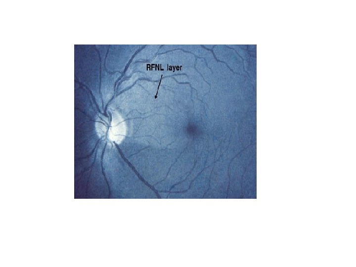 RNFL Ganglion cells axons+astrocytes+ Muller cell processes Visibility: unevenly distributed/ with age IT>ST>SN>IN>S>I>HT>HN Correlates with rim thickness, retinal artery caliber and foveolar location Sandwich arrangment Red –free/ wide beam Achromatic white light