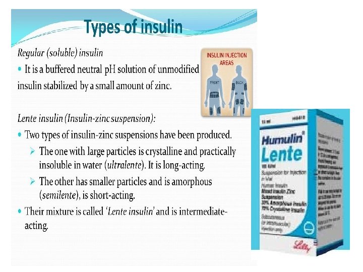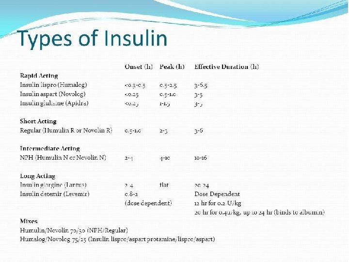 Insulin preparations can be divided into 3 types: 1 -Those of short duration which have a relatively rapid onset of action, namely soluble insulin and the rapid-insulin analogues, insulin aspart. Insulin glulisine, and insulin lispro. 2 -Intermediate action, e. g. isophane insulin; 3 -Those whose action is slower in onset and lasts for long periods: e. g. protamine zinc insulin, insulin detemir, and insulin glargine. -The duration of action of a particular type of insulin varies considerably from one patient to another, and needs to be assessed individually. - Mixtures of insulin preparations may be required. - Treatment should be started with a short-acting insulin (e. g. soluble insulin) or a rapid-acting insulin analogue (e. g. insulin a spart) given before meals with intermediate-acting or long-acting insulin once or twice daily.