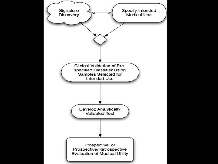 Guidelines Proposed by Simon, Paik, Hayes Prospective-retrospective design 1. 2. 3. 4. Adequate archived tissue from an appropriately designed phase III clinical trial must be available on a sufficiently large number of patients that the appropriate biomarker analyses have adequate statistical power and that the patients included in the evaluation are clearly representative of the patients in the trial. The test should be analytically and pre-analytically validated for use with archived tissue. Testing should be perform blinded to the clinical data. The analysis plan for the biomarker evaluation should be completely specified in writing prior to the performance of the biomarker assays on archived tissue and should be focused on evaluation of a single completely defined classifier. The results should be validated using specimens from a similar, but separate study involving archived tissues.