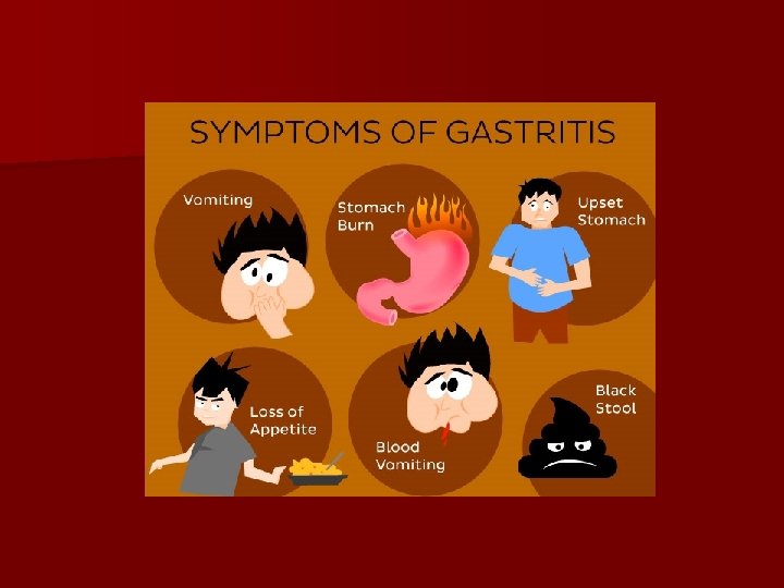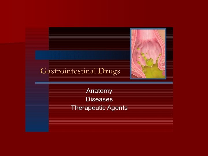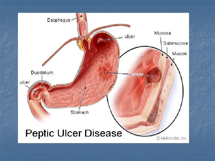 Treatment of peptic ulcer n n n Antimicrobial agents (tetracycline, bismuth subsalicylate, and metronidazole) to eradicate H. pylori infection Misoprostol (a prostaglandin analog) to inhibit gastric acid secretion and increase carbonate and mucus production, to protect the stomach lining Antacids to neutralize acid gastric contents by elevating the gastric p. H, thus protecting the mucosa and relieving pain Avoidance of caffeine and alcohol to avoid stimulation of gastric acid secretion Anticholinergic drugs to inhibit the effect of the vagal nerve on acid-secreting cells H 2 blockers to reduce acid secretion Sucralfate, mucosal protectant to form an acid-impermeable membrane that adheres to the mucous membrane and also accelerates mucus production Dietary therapy with small infrequent meals and avoidance of eating before bedtime to neutralize gastric contents Insertion of a nasogastric tube (in instances of gastrointestinal bleeding) for gastric decompression and rest, and also to permit iced saline lavage that may also contain norepinephrine Gastroscopy to allow visualization of the bleeding site and coagulation by laser or cautery to control bleeding Surgery to repair perforation or treat unresponsiveness to conservative treatment, and suspected malignancy.