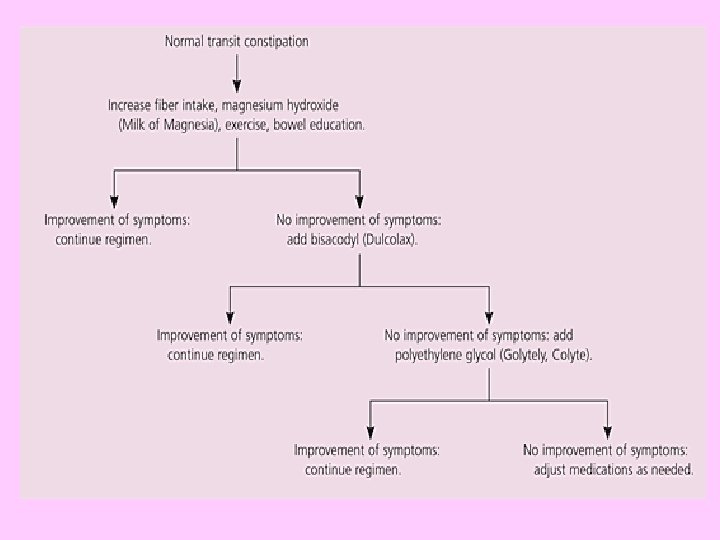 Indications for Use § 1. To relieve constipation in pregnant women, elderly clients whose abdominal and perineal muscles have become weak and atrophied, children with megacolon, and clients receiving drugs that decrease intestinal motility (eg, opioid analgesics, drugs with anticholinergic effects) § 2. To prevent straining at stool in clients with coronary artery disease (eg, postmyocardial infarction), hypertension, cerebrovascular disease, and hemorrhoids and other rectal conditions § 3. To empty the bowel in preparation for bowel surgery or diagnostic procedures (eg, colonoscopy, barium enema) § 4. To accelerate elimination of potentially toxic substances from the GI tract (eg, orally ingested drugs or toxic compounds) § 5. To prevent absorption of intestinal ammonia in clients with hepatic encephalopathy § 6. To obtain a stool specimen for parasitologic examination § 7. To accelerate excretion of parasites after anthelmintic drugs have been administered § 8. To reduce serum cholesterol levels (psyllium products)