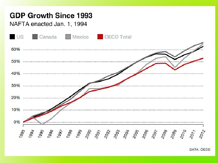 A NEW GLOBAL ECONOMY - NAFTA • In late 1900 s, computer technology + the Internet helped to create a global economy. • The sale of American-made goods abroad essential to American prosperity, but by the 1970 s, however, there was a serious increase in trade deficits = Americans purchased more from foreign nations than American industry and agriculture sold abroad. • In 1994 the North American Free Trade Agreement (NAFTA) was created to increase international trade. Canada, the U. S. , + Mexico joined in a free-trade zone. American manufacturers increased trade with Canada & Mexico. – Lowering international trade barriers U. S. economy benefited from the sale of American exports + the purchase of imports would keep consumer prices, inflation, & interest rates low for Americans.