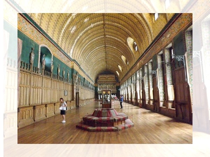 La salle des Preuses Ancienne salle de justice, c’est aujourd’hui la salle la plus imposante du château incarnant le faste de la période Second-Empire avec son architecture impressionnante et sa décoration grandiose. Elle a une longueur de 52 m, une largeur de 9, 50 m et une hauteur de 12 m. La voûte en berceau lambrissées carénée, en double presque le volume. Elle est éclairée par 22 fenêtres. Sous le Second Empire, ce lieu sert de salle de réception ainsi que de galerie de bal. À cet effet, une tribune d’orchestre située au-dessus de la salle d'armes, la domine. Deux ensembles statuaires se répondent aux extrémités de la salle : Le portail est richement orné de statues-colonnes avec, au centre, l’empereur Charlemagne entouré des princes paladins: Olivier, Roland, l’évêque Turpin et Guillaume d'Orange. À son dessus, deux anges soutiennent le blason impérial surmonté d’une couronne. Les sculptures ont été réalisées par Gondran. Seules deux banquettes circulaires dessinées par Viollet-le-Duc constituent le mobilier après le déménagement de la collection d’armures médiévales de Napoléon III qui se trouve maintenant à l’hôtel des Invalides, à Paris