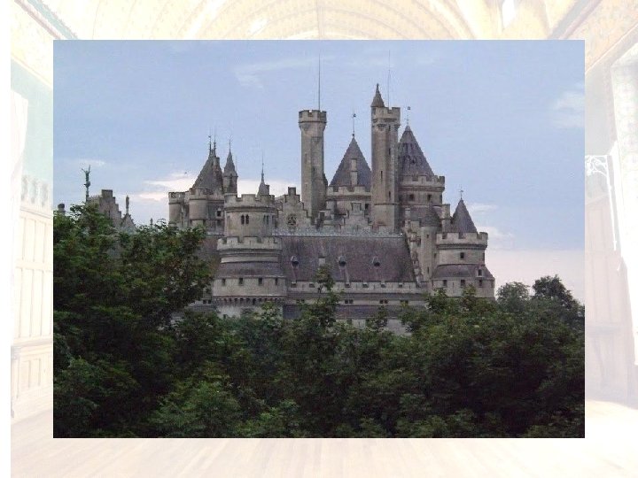 La chambre de Napoléon III C’est une pièce immensément illuminée. Cet avantage provient de sa position au centre du donjon. Viollet-le-Duc a conçu un décor ornemental de lambris sculpté et de peinture au pochoir où la richesse des figures inspirées des bestiaires médiévaux rivalise avec le foisonnement des motifs floraux. Par cette utilisation de la ligne végétale, par la stylisation du dessin et l'emploi d'une vive polychromie, l'architecte s'impose ici, avec cinquante ans d'avance, comme l'un des précurseurs de l'Art nouveau si brillamment illustré par Guimard ou Horta. Symbole récurrent, l'aigle impériale orne poutres, murs et cheminées tandis qu'une frise historiée narre la vie des chevaliers du XIVe siècle. Elle se lit en partant de la droite de la cheminée. Elle décrit l'éducation idéale du chevalier, l'art de combattre. Elle évoque l'exploit que doit réaliser chaque chevalier par la mort d'un griffon. Enfin, elle rappelle que l'un des devoirs d'un seigneur est de rendre la justice. Le linteau de la cheminée s'orne d'abeilles sculptées.