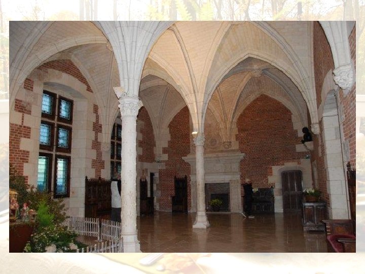 Salle du conseil C'est dans cette vaste salle (la plus grande du château) que le roi réunissait son conseil, véritable pôle du pouvoir royal. La salle possède deux cheminées : la première, disposant d'une hotte trapézoïdale, est encore marquée par la tradition gothique tandis que la seconde (à l'autre extrémité de la salle), illustre le style Renaissance. Le blason d'Anne de Bretagne (fleurs de lys et mouchetures d'hermine), décorent de nombreux éléments de la salle: hotte de la première cheminée, piliers centraux, vitraux des fenêtres sur Loire. L'emblème de Charles VIII (épée flamboyante ou palmée) orne également la hotte de la première cheminée. Au plafond sont inscrits des monogrammes de Charles VIII (entrelacs de C) et d'Anne de Bretagne (lettre A). Sur les côtés, adossés aux murs, on observe de grandes chayères, bancs à dossiers ornés de plis de serviette de style gothique. Sur les murs sont exposés des portraits de rois Bourbon: Henri IV (d'après Franz Pourbus), et Louis XIII (d'après Philippe de Champaigne).