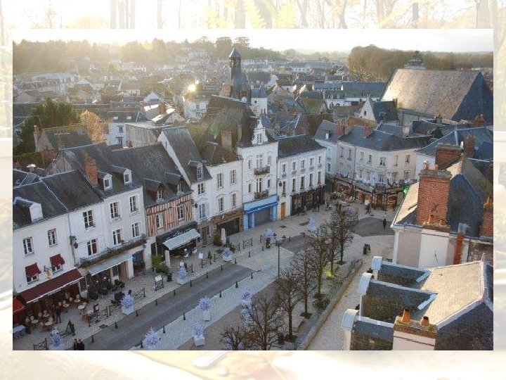 Amboise (étymologiquement « entre deux eaux » , la Loire et l'Amasse) est une ville d'Indre-et-Loire située sur les bords de la Loire, dans l'arrondissement de Tours et la région Centre. La cité doit sa renommée au célèbre château qui la domine, à la porte de l'Horloge, à la collégiale Saint-Denis, au château du Clos Lucé où s'éteignit Léonard de Vinci, à la demeure royale de Château-Gaillard construite par Charles VIII en 1496, célèbre pour ses jardins aménagés par Dom Pacello da Mercogliano Amboise s'étend, pour l'essentiel, sur la rive sud de la Loire, à un endroit où le fleuve se sépare en deux bras. Il enserre une île (dénommée île Saint-Jean, en souvenir d'un prieuré malmené par les crues, Grande-Île ou Île-d'Or), qui fait partie du territoire communal La ville est protégée des crues de la Loire, au sud comme au nord, par de très puissantes digues (promenade du Mail, en forte surélévation par rapport aux premières maisons). Le faubourg établi sur la vaste île fut cantonné dans sa partie la plus élevée et défendu des hautes eaux par une digue (1780). La cité ancienne est surplombée par le plateau sur lequel est établi son château.