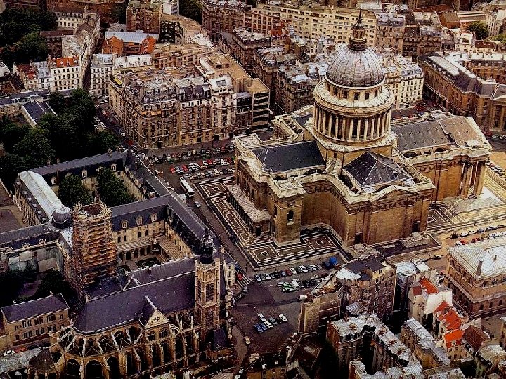 A la suite d’un vœu, Louis XIV décide de bâtir une nouvelle et somptueuse église pour l’abbaye de Ste Geneviève, patronne de Paris. Elle aura la forme d’une croix grecque. Commencé en 1758, l’édifice ne sera achevé qu’à la veille de la Révolution. Le gouvernement d’alors, la Constituante, ne lui a pas laissé cette vocation religieuse. Il est transformé en temple destiné à recevoir les grands hommes de l’époque de la liberté française : c’est le Panthéon, avec sa célèbre inscription : « Aux grands hommes, la patrie reconnaissante » . Voltaire, Jean-Jacques Rousseau, Victor Hugo y reposent, et aussi Jean Moulin, héros de la Résistance, tué par les nazis pendant la 2 ème guerre mondiale. L’église sur la gauche est l’église Saint-Etienne-Du-Mont. A côté de l’église, le lycée Henri IV avec, emmaillotée d’échafaudages, la tour de Clovis, seul vestige de l’Abbaye Sainte-Geneviève.