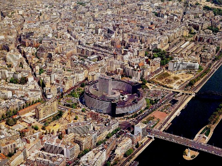 Pour terminer ce survol de Paris, je vous présente cet édifice construit en cercle : La Maison de la Radio. Construite en 1963, elle abrite les différents services de Radio-France. Ses kilomètres de couloirs en font un labyrinthe où il est difficile de se retrouver.