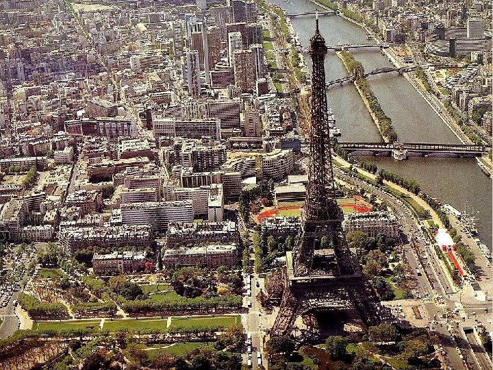 Édifiée en vue de l’exposition de 1889, la Tour Eiffel est l’œuvre de l’ingénieur Gustave Eiffel, le même qui a conçu la charpente métallique de la Statue de la Liberté à New York. Le plus célèbre monument français n’a pas toujours fait l’unanimité. Au départ, de nombreuses personnalités se sont élevées contre ce projet. Avec son antenne de télévision, la Tour s’élève à 320, 75 m. Elle comporte 15 000 pièces métalliques et 2 500 000 rivets. A gauche de la Tour Eiffel, le Champ de Mars.