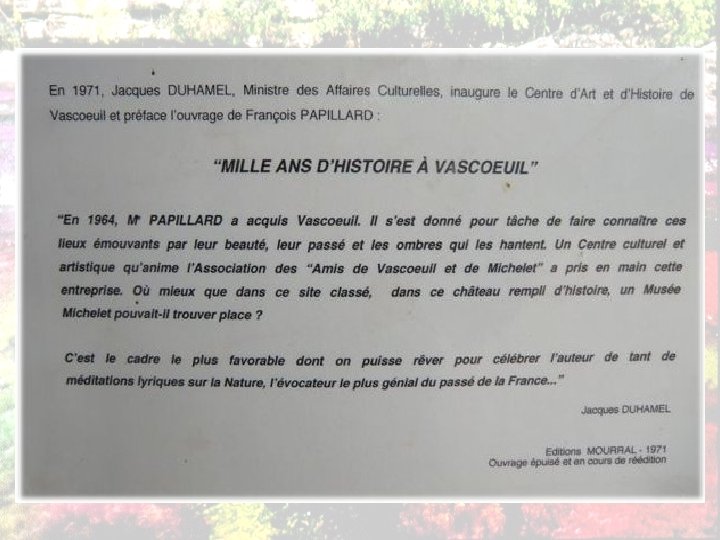 Après leur acquisition en 1964 de ce domaine, les actuels propriétaires entreprirent, parallèlement à sa restauration, d’y créer un centre d’Art et d’ Histoire inauguré en 1970 par Jacques DUHAMEL -Ministre des Affaires Culturelles. Depuis lors, VASCOEUIL doublement inscrit à l’Inventaire Supplémentaire des Monuments Historiques (Château et Colombier) reçoit chaque année de 15 à 20 000 Visiteurs