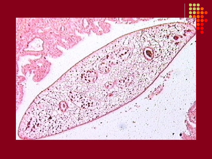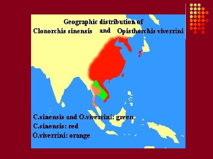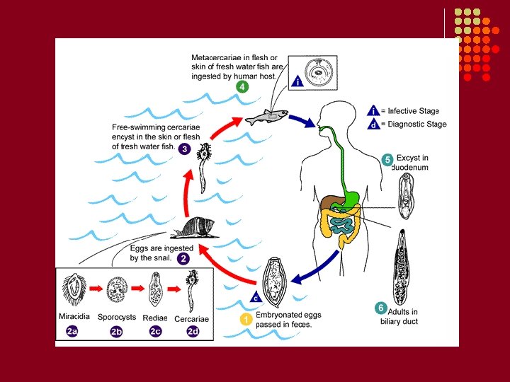 Clonorchis sinensis: Chinese liver fluke. A. Epidemiology: Endemic in Korea, Vietnam, southern China, Japan, Taiwan. About 20 million people are infected. B. Mode of transmission: Ingestion of under- or uncooked fish containing the metacercariae. Alternative fish processing such as freezing, drying, salting or pickling may not destroy the infective form. C. Clinical manifestations: Most infections are asymptomatic. Biliary tract fibrosis and hyperplasia are the most common problems. D. Pathology: Metacercaria are released into the duodenum and the immature flukes enter the biliary ducts where they differentiate into adults (size of 15 mm x 5 mm). Adults release eggs into bile ducts, from which they travel into the intestine; eggs are passed in the stool. The presence of the parasite in the liver leads to inflammation and fibrin deposition. Most symptomatology is due to the host inflammatory response. E. Laboratory diagnosis: Examination of stool samples for small, brown, operculated eggs. No serology. F. Treatment: Praziquantel.