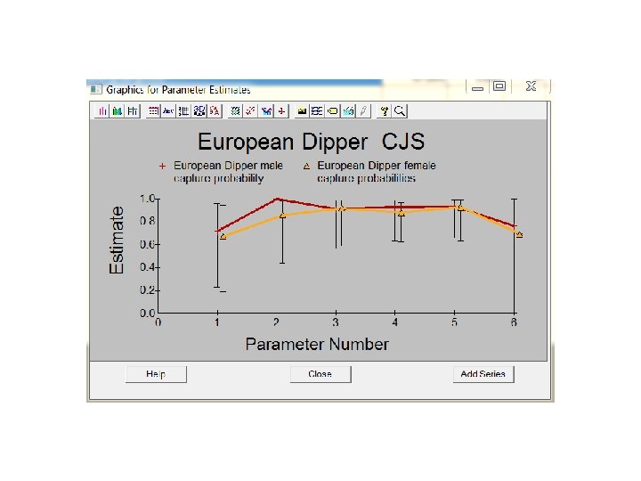 Program Mark Example: Estimation of CJS model for European Dipper 1) Read data 2) Specify format 3) Run basic CJS 4) View Parameter estimates 5) Graph Parameter Estimates