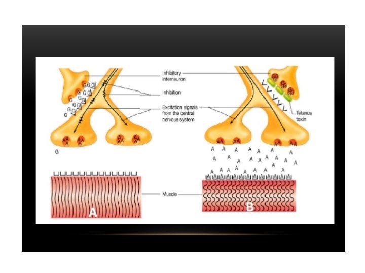 Epidemiology and Pathogenesis • The most sensitive saw-horse and human; medium, ruminant and pork; resistant, chicken • Infection occurs when the spores enters from impaired tissue • Other bacteria present in the wound and necrosis formation provide anaerobic environment • This causes C. tetani spores to turn into vegetative form • It does not spread in tissues, it first reproduces where it enters • After a few weeks, the tetanospasmin spreading to the muscles passes into the lymphatic system and into the blood • Tetanospasmin binds irreversibly to gangliosides in synaptic connections (nerve endings, spinal cord, brain) and inhibits the release of inhibitor-neurotransmitter (glycine) by providing hydrolysis of synaptobrevin. Therefore, acetylcholine (neurotransmitter) is continuously released and spastic paralysis (convulsive paralysis) develops • The toxin does not neutralize with antitoxin after binding to the receptor