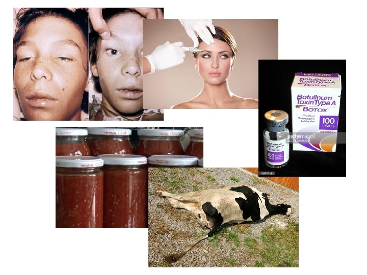Botulismus • The agent is C. botulinum • Spores are oval and subterminal • Mandatory anaerobic, narrow haemolysis in blood agar, large colony • A, B, C�, CB, D, E, F, G, H are toxic types antigenicities are different but clinical semptoms are the same • Type C and D are the most common types • Botulinum is the most effective toxin known (1 mg toxin can kill 10, 000 people) • Botulism occurs when toxins and/or spores are ingested by digestion • A foodborne intoxication – Canned vegetables, bad vegetable and carcass • It is similar to the structure of the tetanus toxin and is released when the enzymatic activation is released (transferred by bacteriophage) – Heat and formol becomes toxoid; not affected by stomach acidity