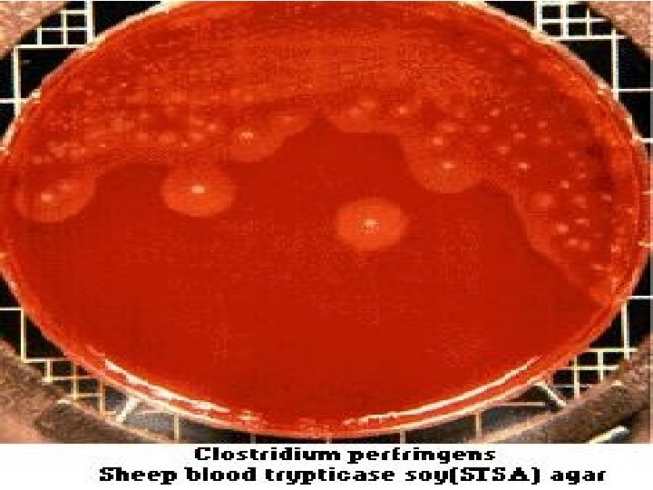 Clostridium perfringens • immotile • encapsulated • aerotolerant • Short rod • Spores oval and subterminal • Double-zone hemolysis – First zone caused by theta, the second zone caused by alpha toxin • Fast growing on mixed culture and at 45 ° C are the distinguishable characters