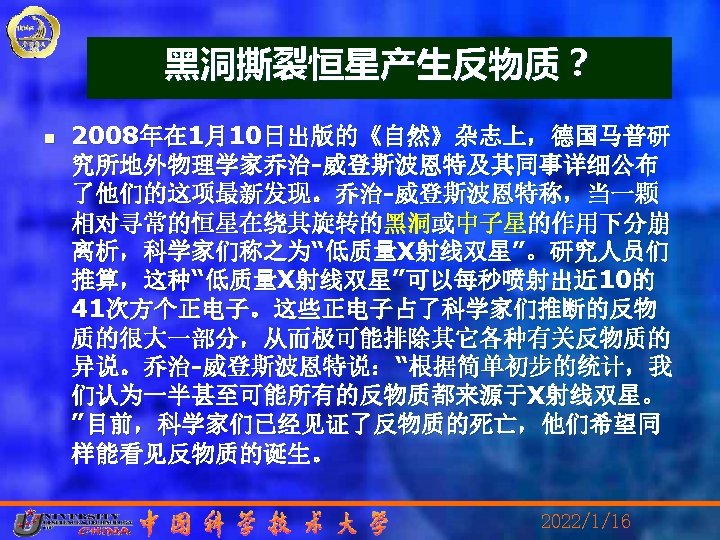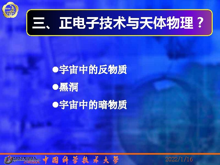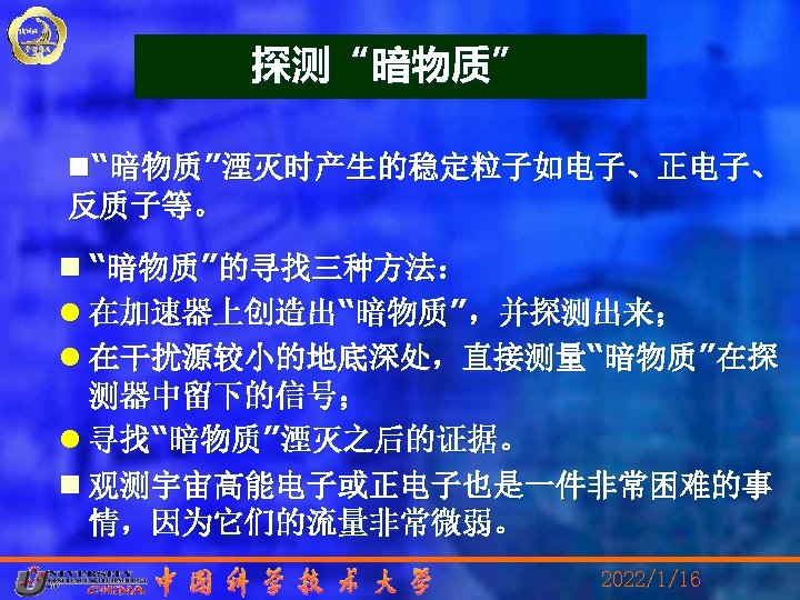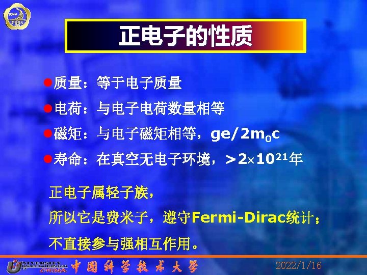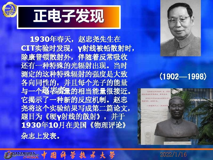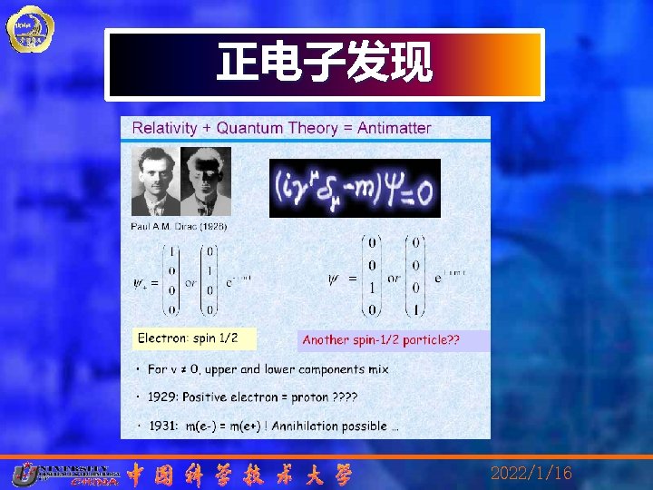 Cloud Chamber Photograph Positron Lead plate Larger curvature of particle above plate means it’s moving slower (lost energy as it passed through) 2022/1/16 Carl Anderson 1905 -1991