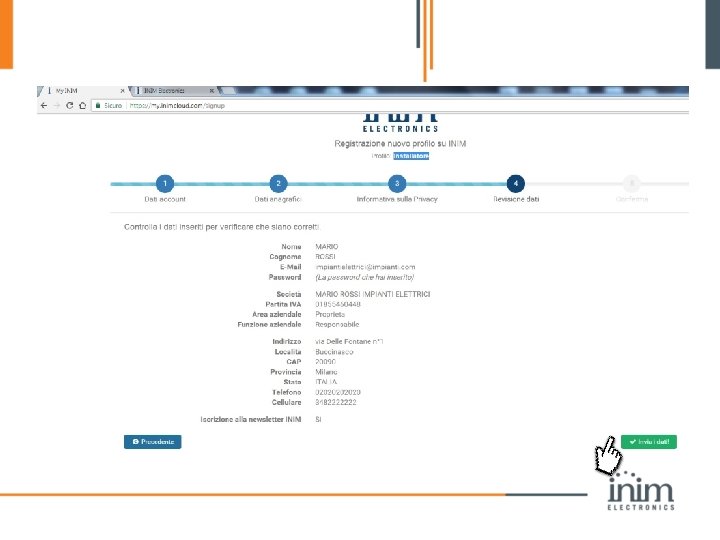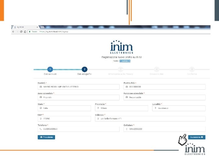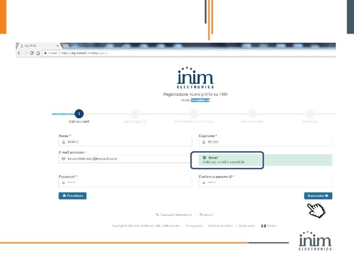 Inim. Cloud is TIER 3 certified • Availability of 99, 982% • redundancy: 1) Hard disk backup 2) Network backup 3) Power line provider backup 4) Power line backup: gasoline generator 5) Geographically replicated