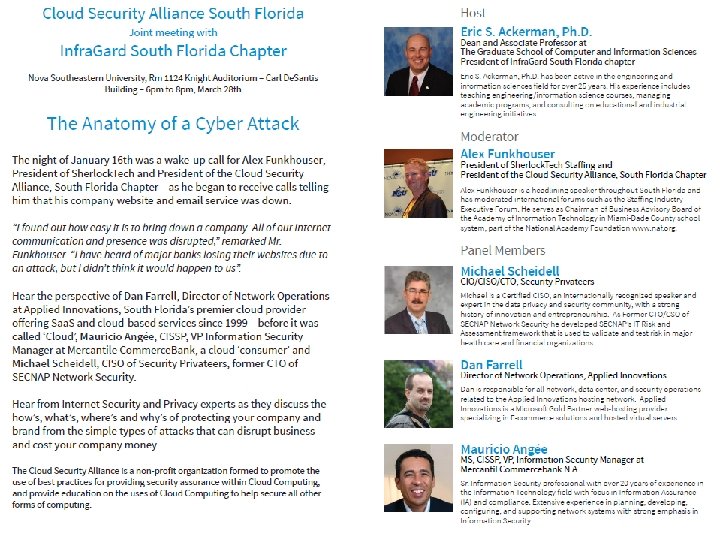 Michael Scheidell, CISO Managing Director, Security Privateers • • • Certified CISO (C|CISO) Founded Florida Datamation in 1982 Founded SECNAP Network Security in 2001 Founded Security Privateers in 2012 Clients include NSA, VISA, Nortel, SAIC, NOAA, DOD, IBM, HP, SAP, Bank United Designed IT Risk and Compliance Audit Practice Built Custom Cloud and Virtualization to support Email Security Member of Free. BSD Development Team Finalist EE Times Innovator of the Year Holder, US Patent Number 7603711 Member: Infragard, ISSA, ISACA, CSA, SFTA