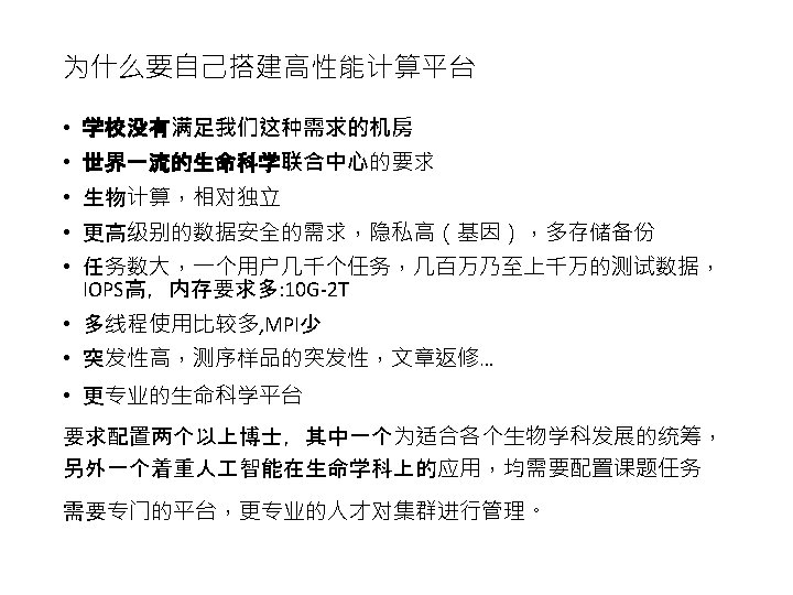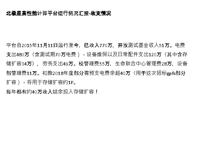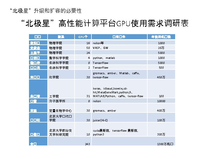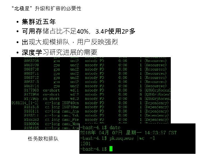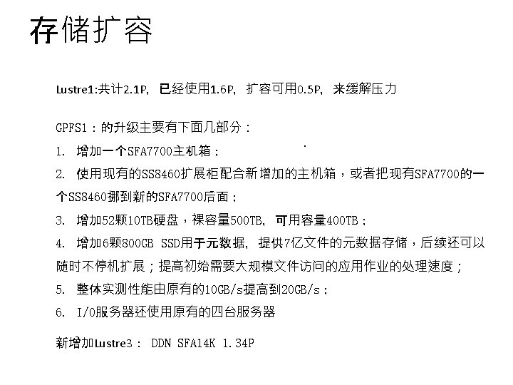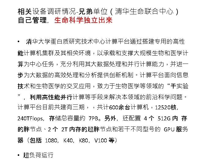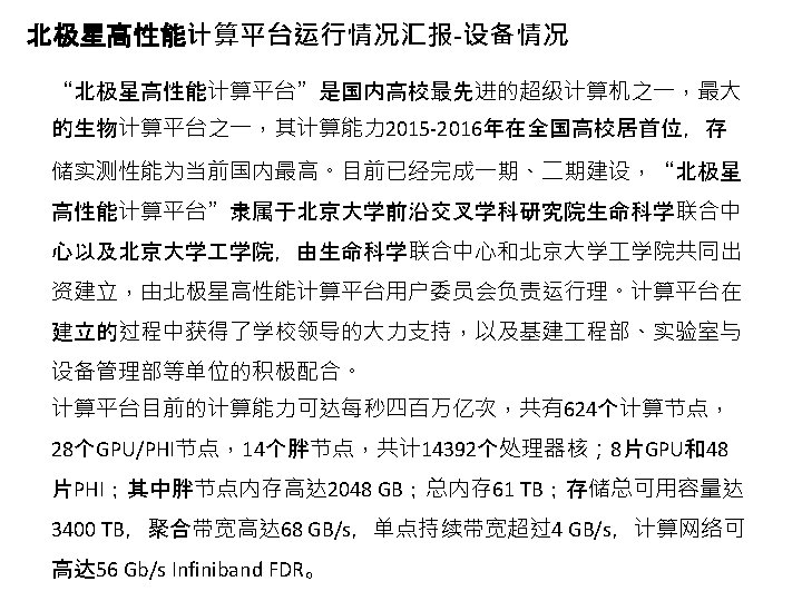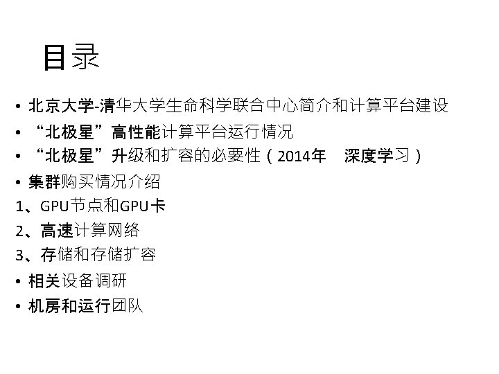 “北极星”升级和扩容的必要性—GPU在冷冻电镜加速 RELION: Plasmodium ribosome on P 100 s PCIe 0. 0140 0. 0120 0. 0112 40. 0 X 37. 3 X 33. 7 X 0. 0101 0. 0100 1/Minutes 0. 0080 0. 0070 0. 0060 23. 3 X 15. 3 X 9. 0 X 0. 0046 0. 0040 Running RELION version 2. 0. 3 The blue node contains Dual Intel Xeon E 5 -2690 v 4@2. 6 GHz (Broadwell) CPUs The green nodes contain Dual Intel Xeon E 5 -2690 v 4@2. 6 GHz (Broadwell) CPUs + Tesla P 100 PCIe (16 GB) GPUs 0. 0027 0. 0020 0. 0003 0. 0000 1 Broadwell 1 node + 2 nodes + node 1 x P 100 2 x P 100 4 x P 100 8 x P 100 PCIe (16 GB)PCIe (16 GB) PCIe per node (16 GB) 3 nodes + 12 x P 100 PCIe (16 GB) 4 nodes + 16 x P 100 PCIe (16 GB) Data Citation: http: //en. community. dell. com/techcenter/hi gh-performancecomputing/b/general_hpc/archive/2017/03/1 4/application-performance-on-p 100 -pcie-gpus 10