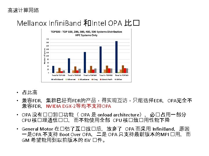 DESIGNED TO TRAIN THE PREVIOUSLY IMPOSSIBLE 2 Two GPU Boards 8 V 100 32 GB GPUs per board 6 NVSwitches per board 512 GB Total HBM 2 Memory interconnected by Plane Card NVIDIA Tesla V 100 32 GB 1 Twelve NVSwitches 3 2. 4 TB/sec bi-section bandwidth 9 4 Eight EDR Infiniband/100 Gig. E 1600 Gb/sec Total Bi-directional Bandwidth 5 PCIe Switch Complex 30 TB NVME SSDs 8 Internal Storage 6 Two Intel Xeon Platinum CPUs 7 1. 5 TB System Memory Dual 10/25 Gb/sec 9 Ethernet NVIDIA DGX-2等均不支持OPA