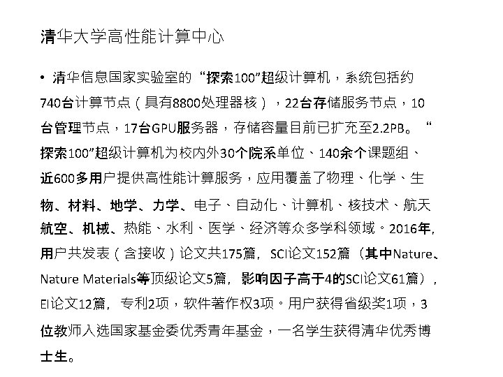 “北极星”升级和扩容的必要性—GPU在分子动力学上加速 AMBER 16 AMBER MD Performance for Cryptochrome on CLS HPC (ns/Day) 100 80 80 60 40 4 X 20 17 15 40 2 x K Cryptochrome 6 9305 atoms gp u/ e( 12 od 5 N s/ cn P 1 00 /1 x. P 0 C o. 10 0 . . 0 4 x~5 x Faster than CPU only system or two K 40 cards.