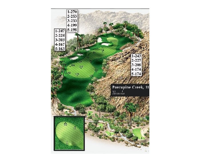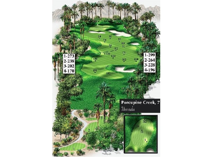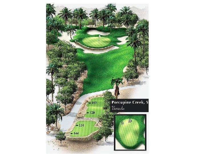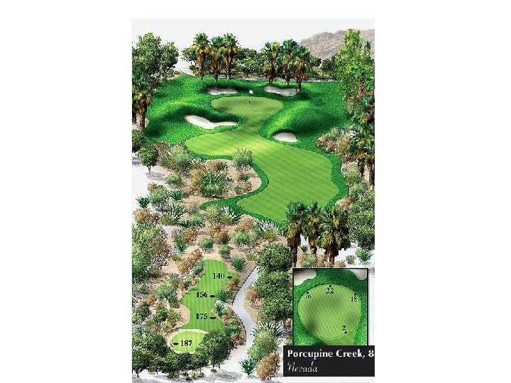 Golf Course Design • Tee (where you start from) • Rough (thicker grass • Fairway surrounding the fairway) (the safest path toward the hole) • Hazards (such as sand traps, water, and trees) • Green (smooth, short grass near the hole)