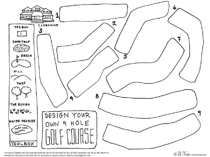 Check out the diagrams of many different types of golf holes from famous golf courses around the world. Think about how you and your team might design your own unique golf hole. Things to think about: • shape (straight, curved, dogleg. . . ) • length • flat, hilly, downhill, uphill • hazards Remember, the best golf holes should not be TOO EASY or TOO HARD.