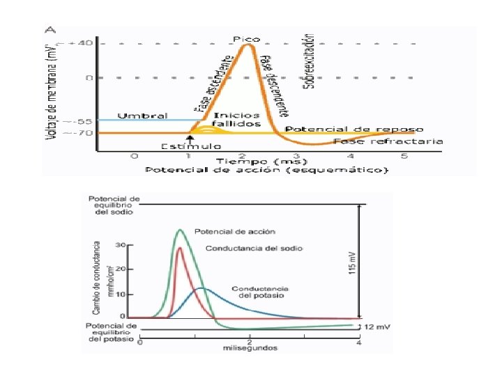 Generación de un potencial de acción Etapas: 1. - Cambia la conductancia de la membrana para Na+ 2. 3. 4. 5. 6. 7. - Despolarización de la membrana por encima de un potencial umbral produce la apertura de los conductos de Na+ Los iones Na+ fluyen a través de la membrana al interior celular. La entrada de iones Na+ despolariza más la membrana y se abren muchas compuertas para Na+. Este cambio positivo entre despolarización y entrada de Na+ da lugar a un cambio rápido y profundo de potencial de membrana, desde -60 a 30 m. V en 1 msg Canal de Na+ se cierran espontáneamente y se abren los de K+. Los iones K+ fluyen al exterior y en 2 msg el potencial de membrana vuelve a tener un valor negativo, -75 m. V (valor de equilibrio para los iones K+ en condiciones celulares)