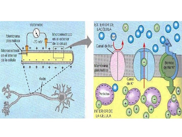 CONDUCCIÓN ELECTROQUÍMICA EN LAS NEURONAS Casi todas las células del organismo presentan diferencia de potencial electroquímico través de su membrana plasmática, siendo el exterior positivo respecto al citosol: membrana Polarizada. Este potencial de membrana en reposo o Potencial de Reposo se expresa con signo negativo tomando como referencia el medio intracelular. Dependiendo del tipo celular este potencial puede ir desde -7 m. V hasta -100 m. V (en la neurona el potencial transmembranoso es aproximadamente de -70 m. V).