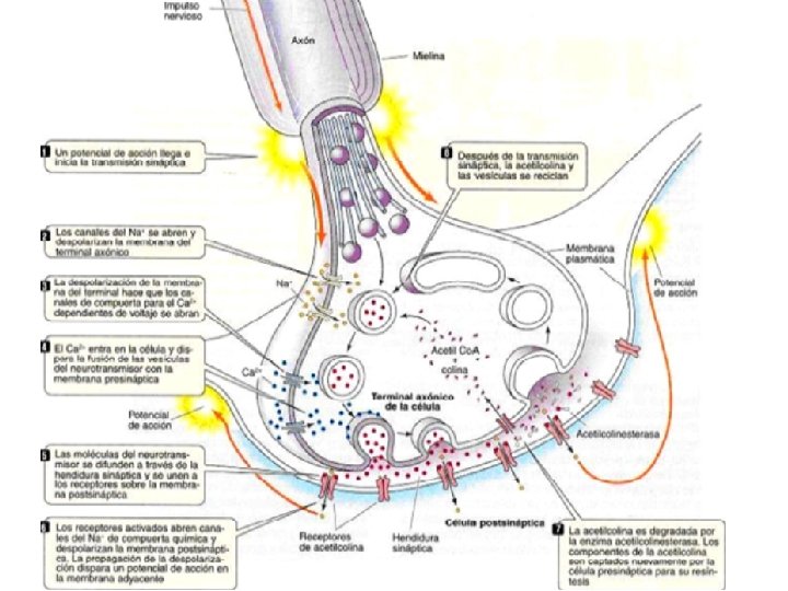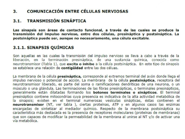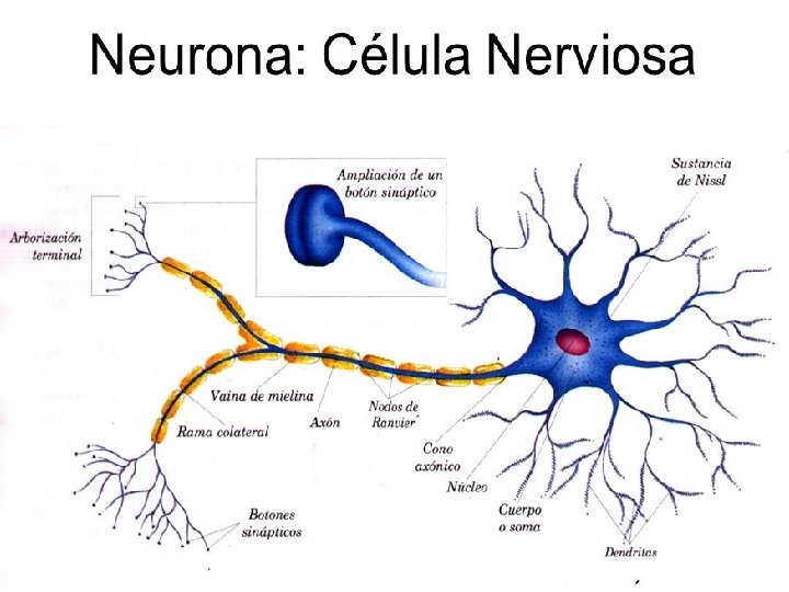 NEURONA: ESTRUCTURA Axón, en general solo uno, de mayor o menor diámetro que las dendritas, muchas veces rodeado por una vaina de mielina. Su función principal es conducir impulsos desde el soma hacia el terminal sináptico (conducción centrífuga). La porción que une el soma neuronal con el axón se denomina cono axonal. La zona del terminal axonal se denomina en general telodendrón (o arborización terminal). El axón con sus envolturas asociadas se conoce como fibra nerviosa.
