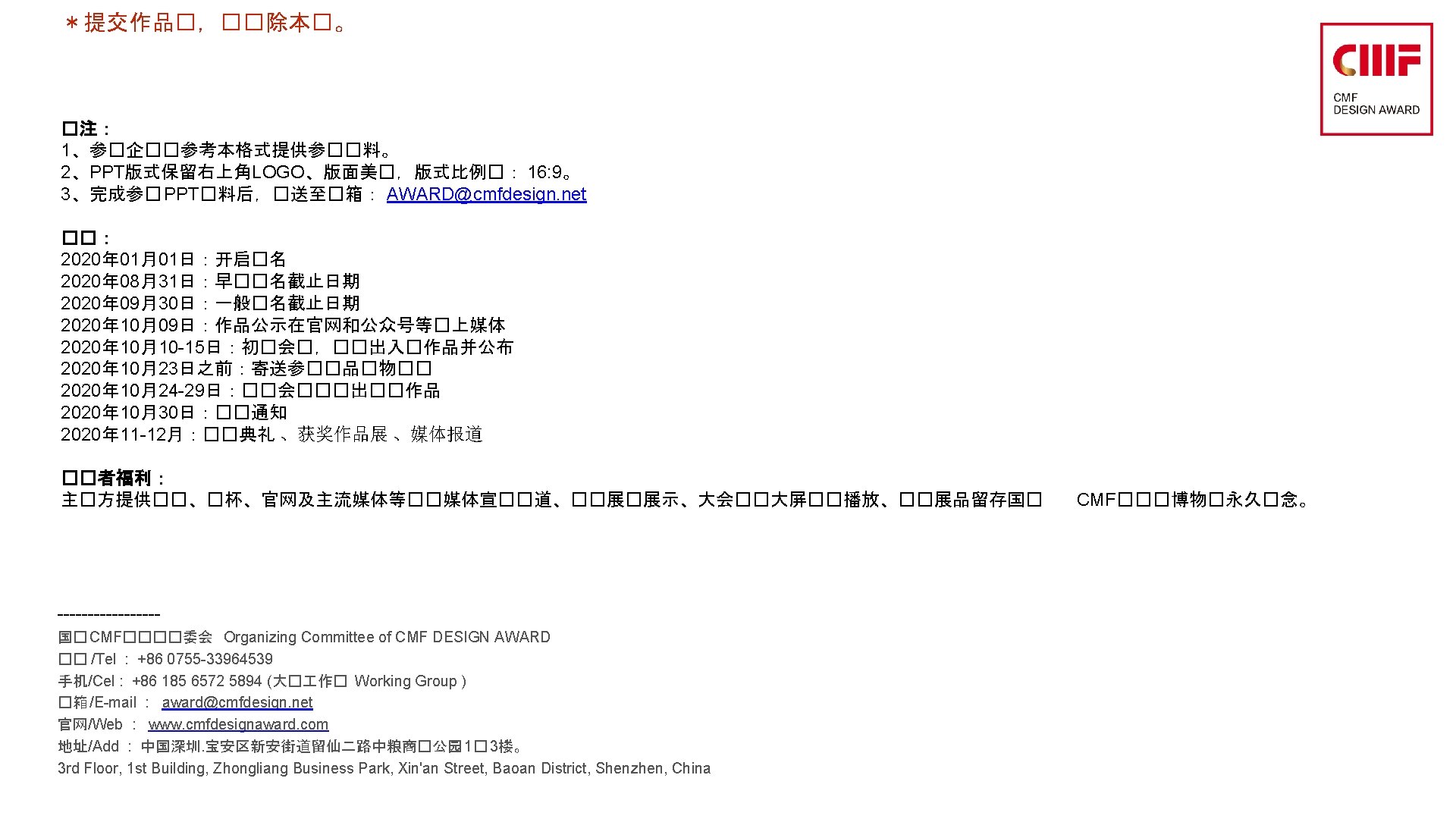 CMF DESIGN AWARD 报名申请表 CMF DESIGN AWARD APPLICATION FORM 公司名称 Company name 部门名称 Department name 所属行业 Industry 主营产品 Main product 办公地址 Office address 公司电话 Office number 传真 Fax 邮政编码 Postal 网址 Website Code 申报人(可酌情增加/减少)Applicant(Increase / decrease as appropriate): 1 姓名 Name 2 姓名 Name 3 姓名 Name 联系人姓名 Contact name 职务 Post 联系电话 Number 注:申报产品是否可公布? Note: Can the declared product be announced? 邮箱 Mailbox