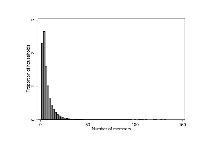 • What if we would like to convert to fractions? • Compute total number of households by summing table 1, then divide each value of table 1 by the total • sum(table 1) returns the sum of table 1 up to the current observation • total[_N] returns the value of total in the last observation drop if HH_SIZE <= 0 generate total = sum(table 1) generate hh_fraction = table 1/total[_N] twoway bar hh_fraction HH_SIZE if HH_SIZE > 0, xscale(log) scheme(s 1 mono) xlabel(0 1 2 5 10 20 50 100 150) ytitle("Proportion of households")