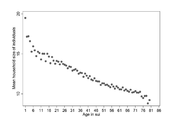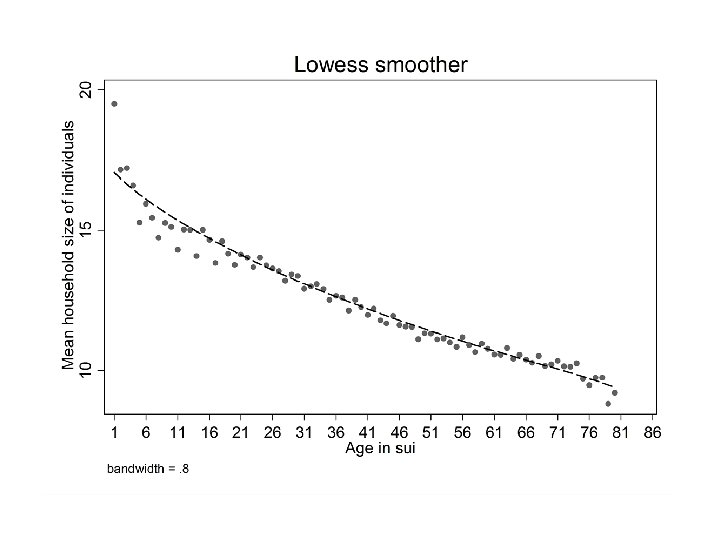 Mean household size of individuals by age keep if AGE_IN_SUI > 0 & SEX == 2 & YEAR >= 1789 & HH_SIZE > 0 bysort AGE_IN_SUI: egen mean_hh_size = mean(HH_SIZE) bysort AGE_IN_SUI: generate first_in_age = _n == 1 twoway scatter mean_hh_size AGE_IN_SUI if first_in_age & AGE_IN_SUI <= 80, scheme(s 1 mono) ytitle("Mean household size of individuals") xlabel(1(5)85) xtitle("Age in sui") lowess mean_hh_size AGE_IN_SUI if first_in_age & AGE_IN_SUI <= 80, scheme(s 1 mono) ytitle("Mean household size of individuals") xlabel(1(5)85) xtitle("Age in sui") msize(small)