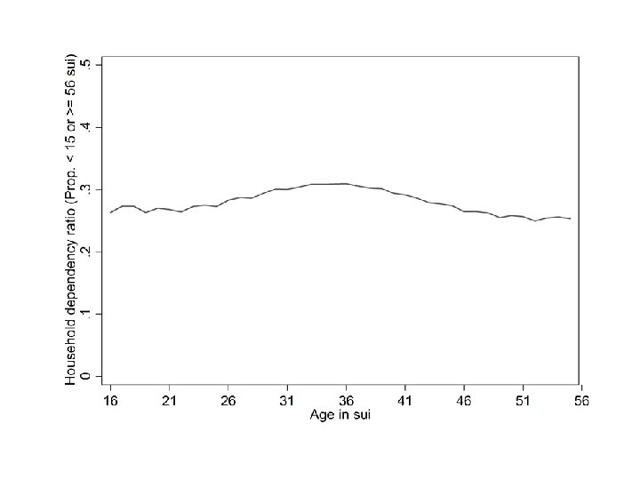 Creating measures of age and sex composition of the household bysort HOUSEHOLD_ID: egen males_1_15 = total(PRESENT & SEX == 2 & AGE_IN_SUI >= 1 & AGE_IN_SUI <= 15) bysort HOUSEHOLD_ID: egen males_16_55 = total(PRESENT & SEX == 2 & AGE_IN_SUI >= 16 & AGE_IN_SUI <= 55) bysort HOUSEHOLD_ID: egen males_56_up = total(PRESENT & SEX == 2 & AGE_IN_SUI >= 56) bysort HOUSEHOLD_ID: egen females_1_15 = total(PRESENT & SEX == 1 & AGE_IN_SUI >= 1 & AGE_IN_SUI <= 15) bysort HOUSEHOLD_ID: egen females_16_55 = total(PRESENT & SEX == 1 & AGE_IN_SUI >= 16 & AGE_IN_SUI <= 55) bysort HOUSEHOLD_ID: egen females_56_up = total(PRESENT & SEX == 1 & AGE_IN_SUI >= 56) generate hh_dependency_ratio = (males_1_15+males 56_up+females_1_15+females 56_up)/HH_SIZE bysort AGE_IN_SUI: generate first_in_age = _n == 1 bysort AGE_IN_SUI: egen mean_hh_dependency_ratio = mean(hh_dependency_ratio) twoway line mean_hh_dependency_ratio AGE_IN_SUI if first_in_age & AGE_IN_SUI >= 16 & AGE_IN_SUI <= 55, scheme(s 1 mono) ylabel(0(0. 1)0. 5) xlabel(16(5)55) ytitle("Household dependency ratio (Prop. < 15 or >= 56 sui)") xtitle("Age in sui")