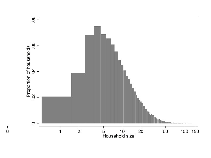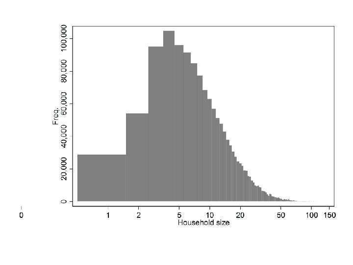 • This isn’t particularly appealing • A log scale on the x axis would help • In STATA, histogram forces fixed width bins, even when the x scale is set to log • We can collapse the data and plot using twoway bar or scatter table HH_SIZE, replace twoway bar table 1 HH_SIZE if HH_SIZE > 0, xscale(log) scheme(s 1 mono) xlabel(0 1 2 5 10 20 50 100 150)