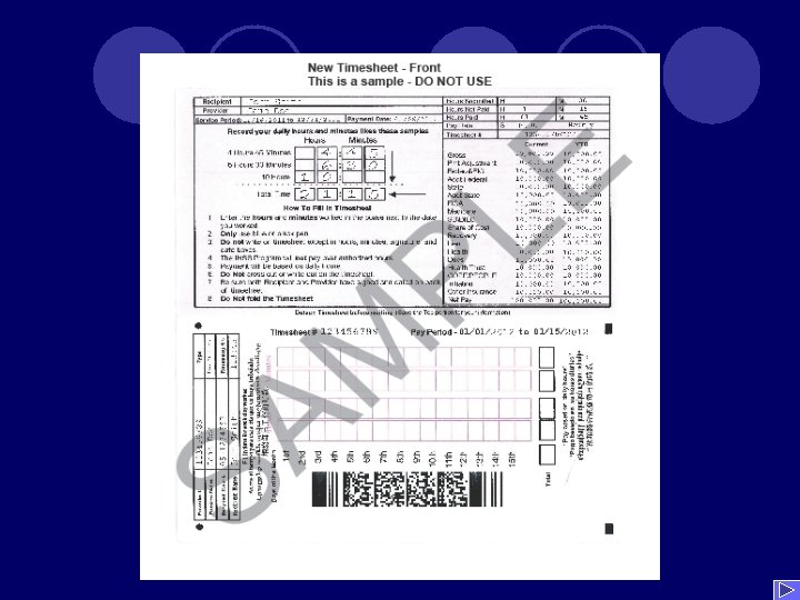 The RIGHT way to fill out the new timesheets l Fill out timesheet right side up, with the provider number box on top l Provider and recipient must sign and date the back side l YOU CAN LEAVE TOTAL HOURS BLANK