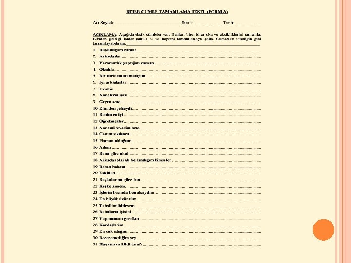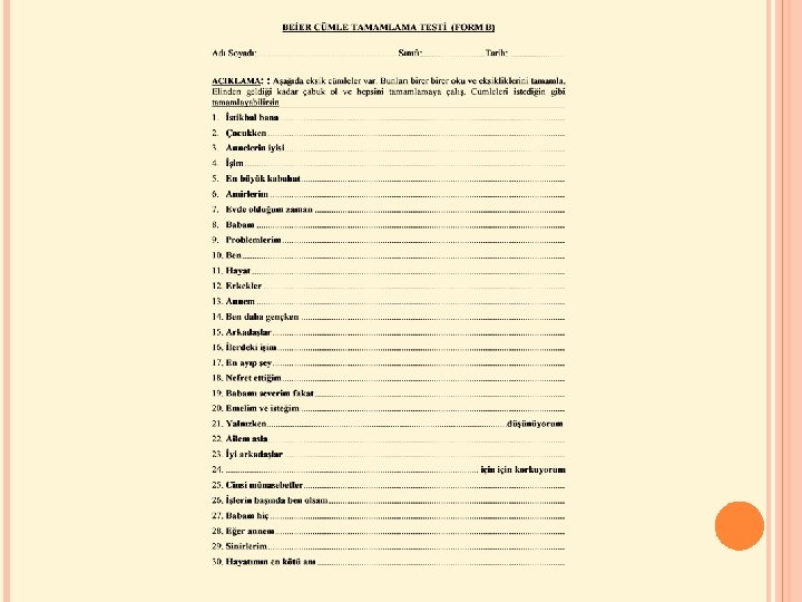 BEIER CÜMLE TAMAMLAMA TESTI 1. Zaman açısından ekonomiktir. 2. Genellikle bireyin önemli bazı duyguları, tavırları, kaygıları hakkında çabuk ve oldukça doğru bir özetini verir. 3. Bireylerin kendileri ve dünyaları hakkında ortaya çıkarılamayan sorunların ifade edilmesi ya da açığa çıkarılması için fırsatlar hazırlar.