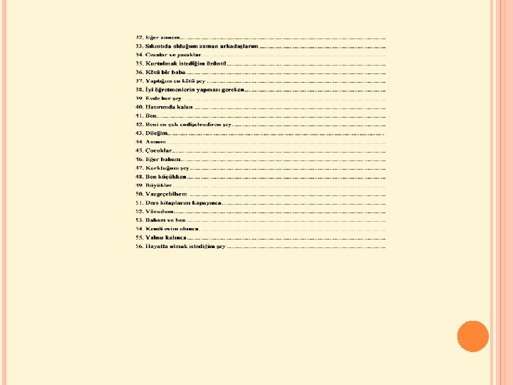 Yarım bırakılmış cümlelerin tamamlanması beklenir. Beni kızdıran şey…. . Aklımda…. Kadınlar…. (Anastasi, 1961)