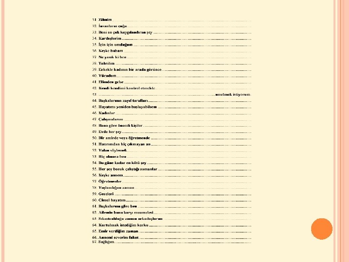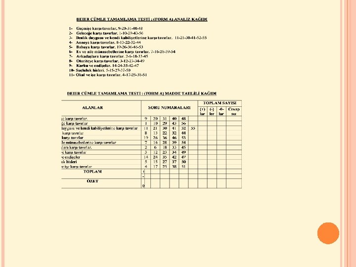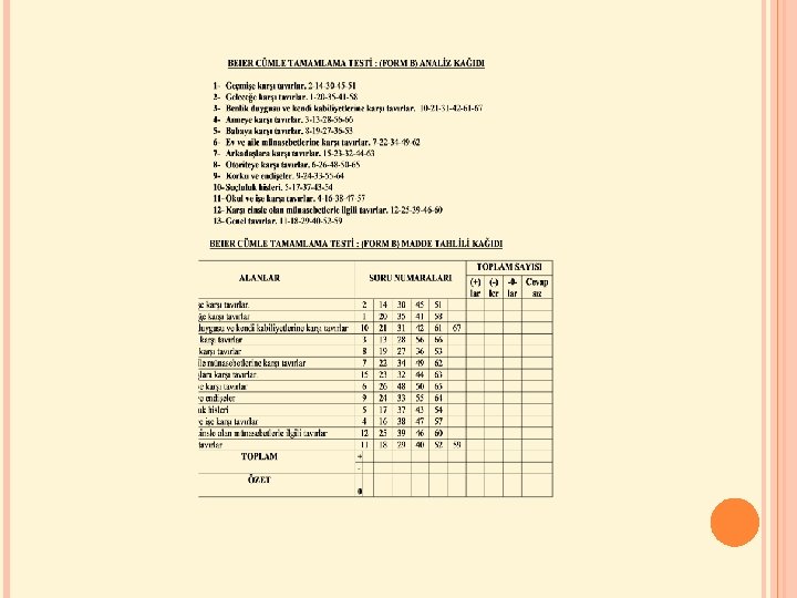 7) Arkadaşlarla ilgili tutumlar 8) Otoriteye karsı sergilenen tutumlar 9) Korku ve endişeler 10) Suçluluk duyguları ve ahlak gelişimi 11) Okul ve isle ilgili tutumlar 12) Cinsel yasamla ilgili tutumlar 13) Çeşitli durumlarla ilgili tutumlar